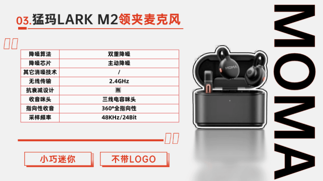 猛玛(MOMA)是一家专注于音频设备的品牌,LARK M2是其推出的一款小巧无线麦克风。该产品延续了LARK MIX“做小做精”的理念,尺寸进一步缩小,重量仅7g,佩戴无感。它采用全指向收音设计,具备70dB信噪比和一键双档降噪功能,适合在嘈杂环境中使用。LARK M2的钛合金夹扣设计,佩戴稳固,不容易脱落,以及它的特色无LOGO设计,避免拍摄时因品牌标识引发公众质疑,适合需要隐蔽性好的场景需求。