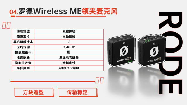 罗德(RØDE)是一家专业的音频设备制造商,以生产高质量的麦克风和音频配件而闻名。Wireless ME是一款一拖一无线麦克风系统,采用2.4GHz数字传输技术,传输范围可达100米以上。其发射器和接收器都为经典的方块造型设计,重量均为32g,体积较大,不过便于携带和使用。它还具备GainAssist技术,能够自动优化音频增益,提供清晰的音频。Wireless ME适用于相机、电脑和智能手机等多种设备,并且与免费的罗德视频和音频应用程序兼容。