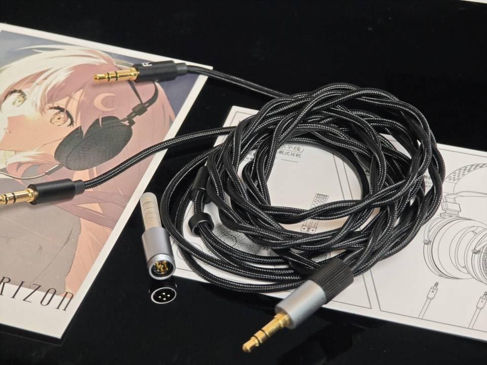 将盒中配件一一拿出,全套包括耳机本体、耳机线材、4.4mm立体声平衡插头、耳罩、说明书、明信片等。