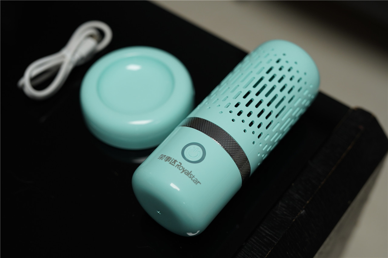 荣事达钛果蔬净化机的外观颜色为浅蓝色,并不是那种扎眼的亮蓝,更像雨后天空的淡青色,磨砂工艺让指纹很难附着。机身正面只有一个圆形按键,按下时会亮起工作状态的呼吸灯,品牌LOGO也标记在正面位置。
