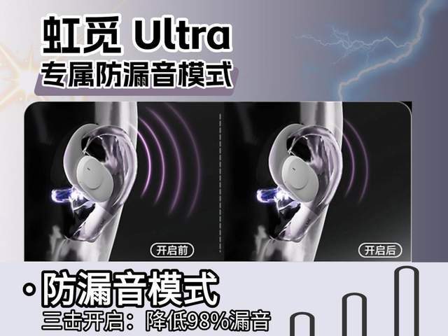 虹觅 Ultra搭载的16.2mm超大尺寸石墨烯振膜让声音更细节,保留了原始的声音,搭配了H-zone全景空间音效用来优化音质的同时还能提高音乐的氛围感,三击耳机能瞬间切换防漏音模式,避免路人听见耳机声音的尴尬情况,把开放式耳机的缺点很好的解决了,触片充电方式优化了传统触点式充电容易接触不良的痛点,充电效率更高更稳定,智能一拖二能让你做到双设备无缝切换,这样的配置只有百元的价格,性价比非常的高。耳机拥有8+32小时综合续航和四麦ENC降噪功能,优化了通话收不到声音的问题,搭配的IPX6防水层在做运动暴汗时都能稳定输出。搭载的蓝牙5.4版本芯片还能提高综合性能,让耳机的整体表现提升了一个等级。耳机8g单耳重量佩戴起来更轻量化,人耳流线型设计的设计,使佩戴起来更贴合舒适,并且液态硅胶材质在佩戴起来更轻柔肌肤,久戴也很舒适。