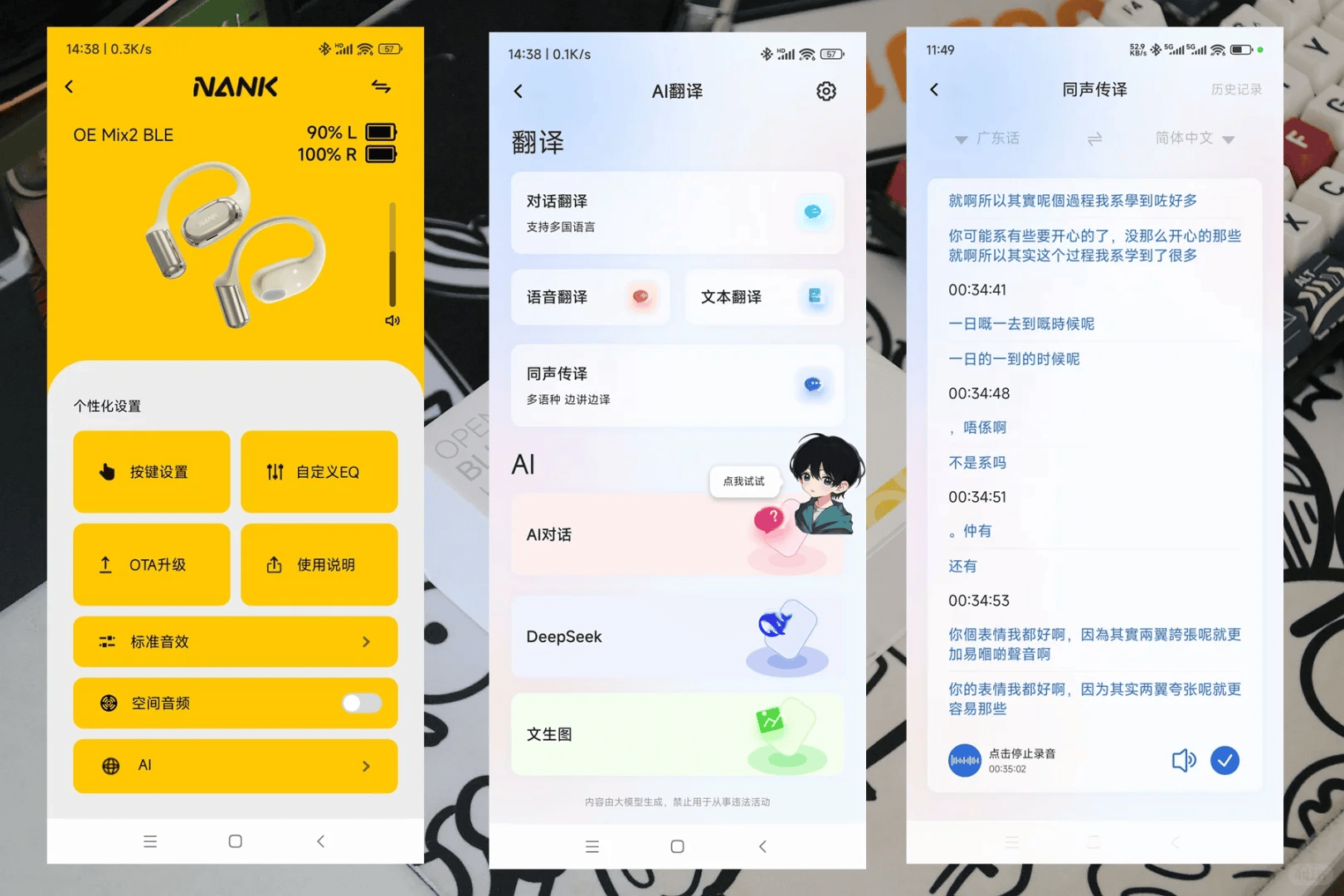 功能丰富且强大。集成讯飞、DeepSeek 等多模态南卡 AI 智能系统,拥有 AI 翻译、AI 对话、AI 语音助手、AI 生成图像、AI 深度搜索,以及写作、翻译、情绪识别、内容生成等数十项 AI 能力。搭载升级版 DS 2.0 指向性声学技术,并创新性引入 U 型声学通道结构,算法与结构双重防漏音,带来私密聆听体验。支持专属 NANK APP 智能操控,可通过手机实现音效模式切换、空间音频调节、AI 语音功能开关、固件在线升级等操作。采用专门为开放式耳机打造的蓝牙 5.4 芯片 SOC,通讯效率高、抗干扰性强,达到秒连、秒响应。南卡 Game mode 低延时处理技术,一键进入游戏模式,低延时至 60ms,双麦 Enc 通话降噪,能消除通话时多频段环境噪音,保证清晰交流。整机还采用“抗衰减性”设计,2 年音质性能衰减不到 5%。