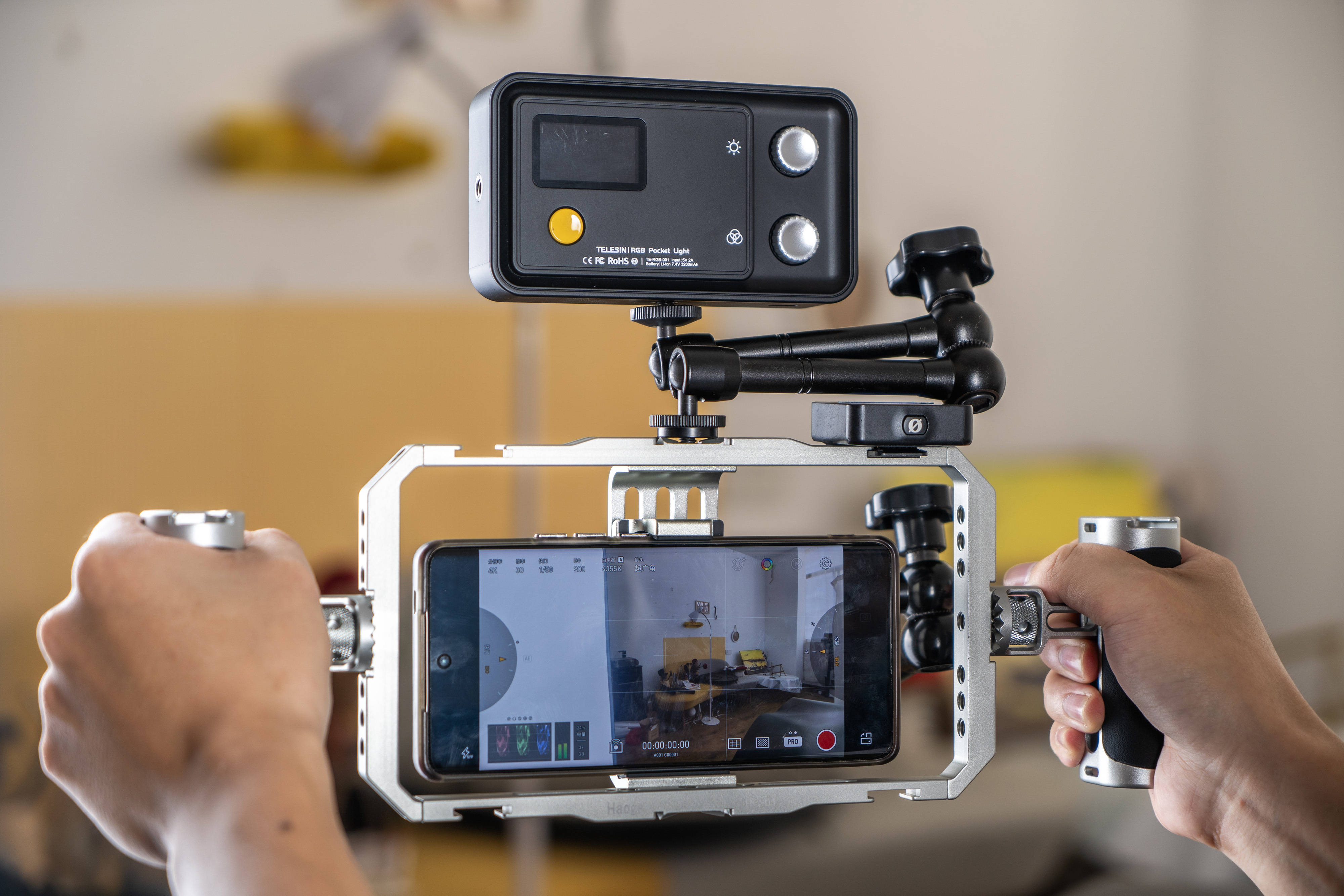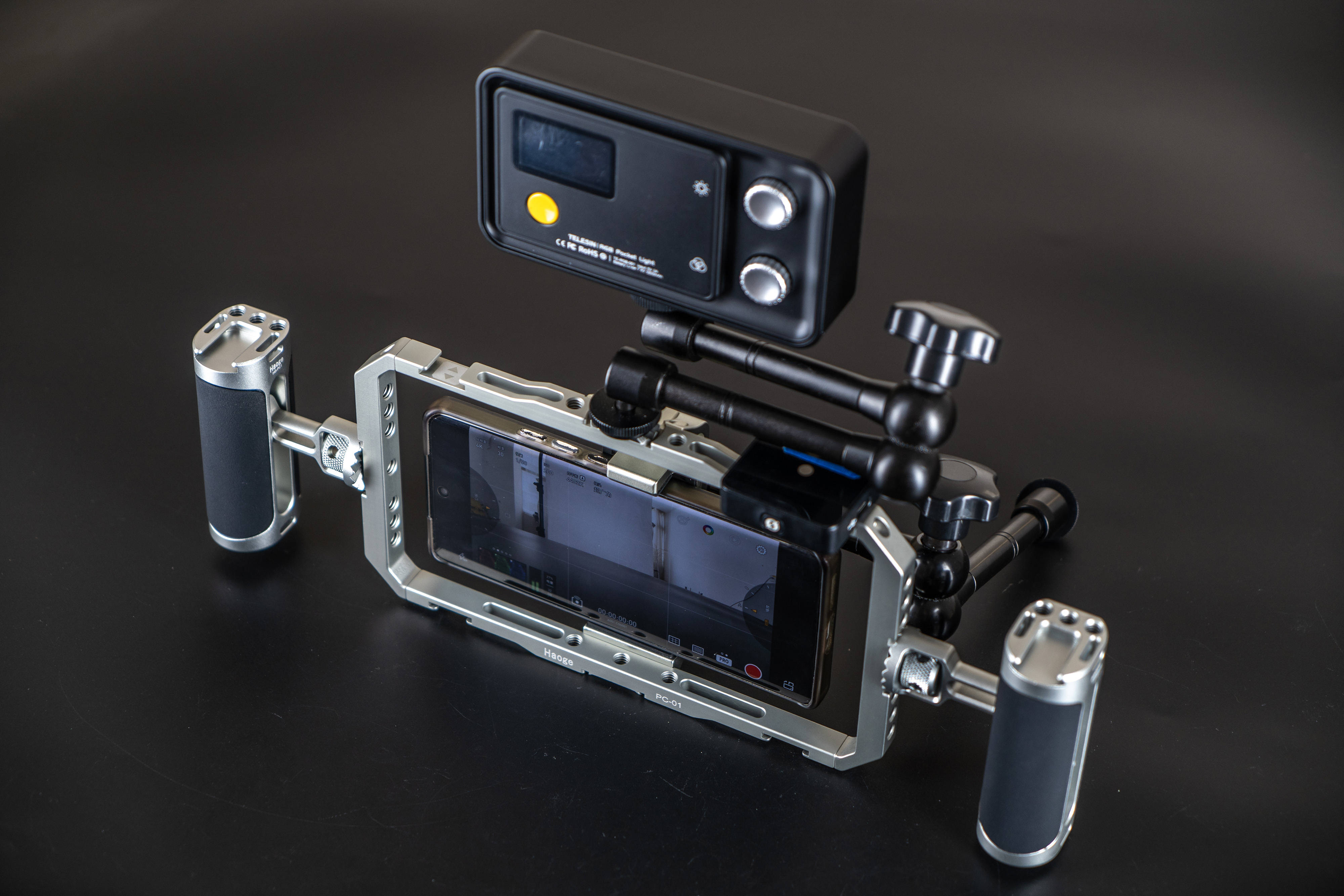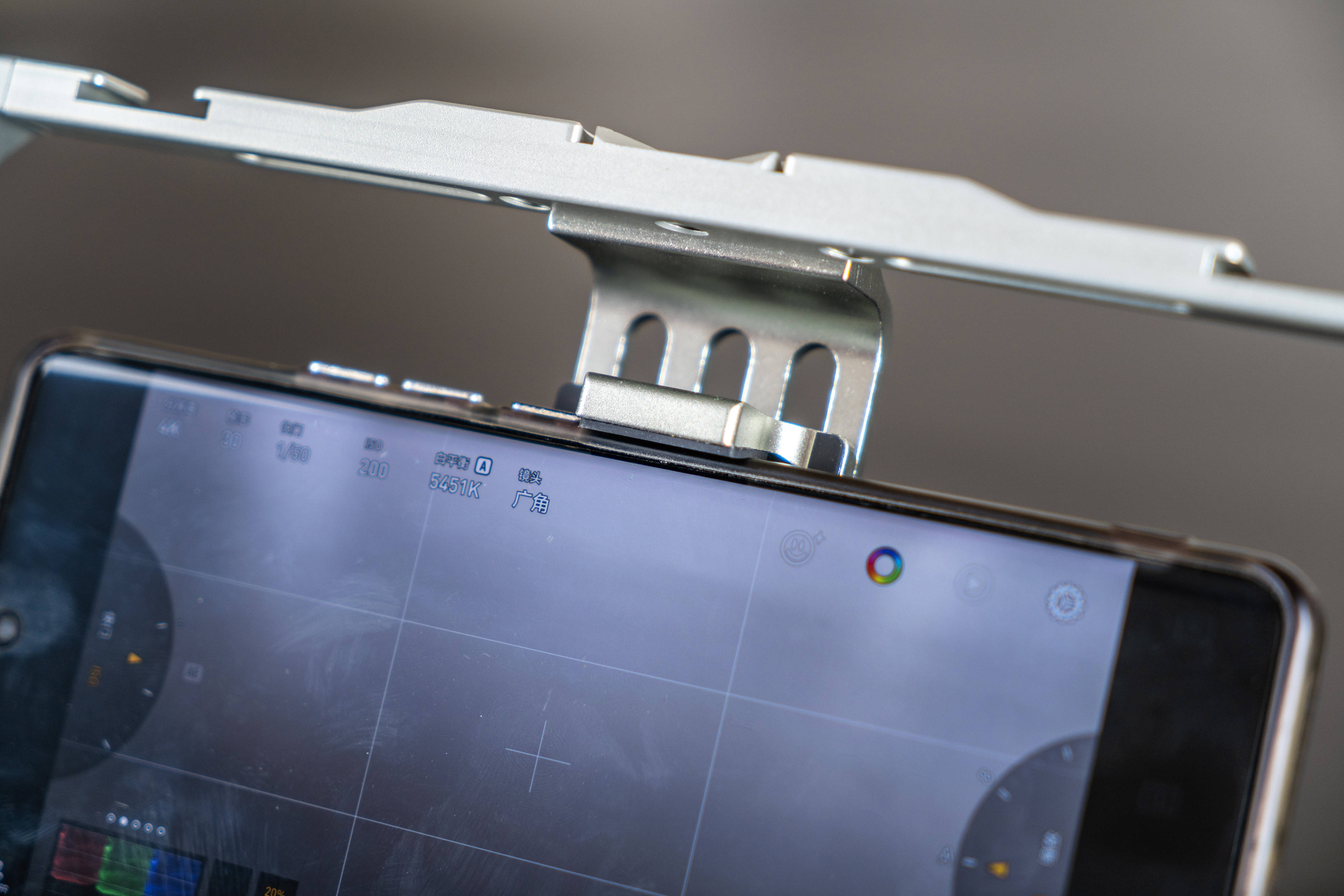 ▼我在顶部中间的1/4螺纹孔上通过魔术手安装了一个RGB补光灯,由于重心改变无法平放桌面,所以我又在背板背面1/4螺纹孔上装了一根魔术手当做支撑杆,专业的感觉一下就上来了,就这样简单的一套组合起来,拍完还能随手往平面上一放进行回看,手机因为有兔笼保护,完全不怕磕碰