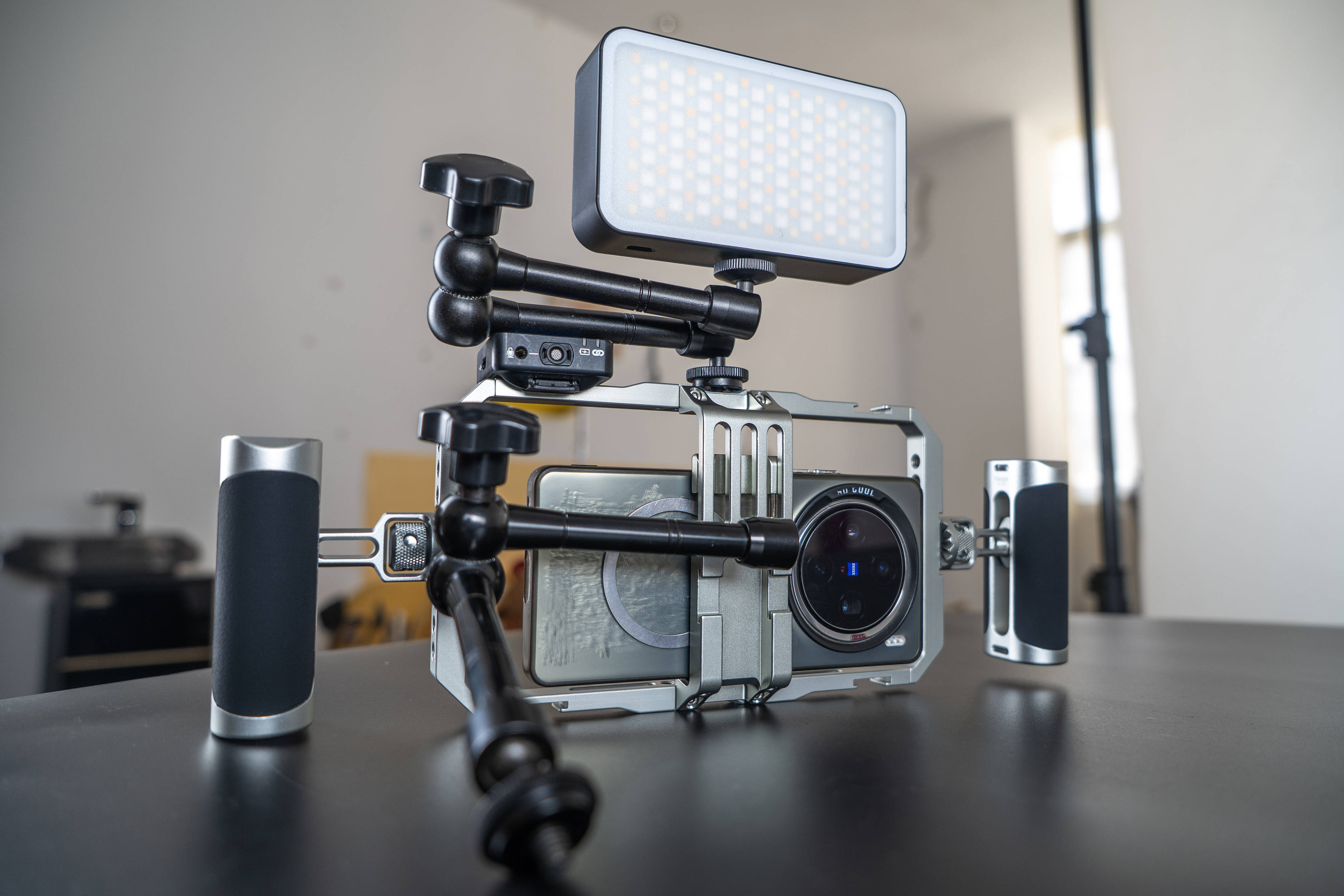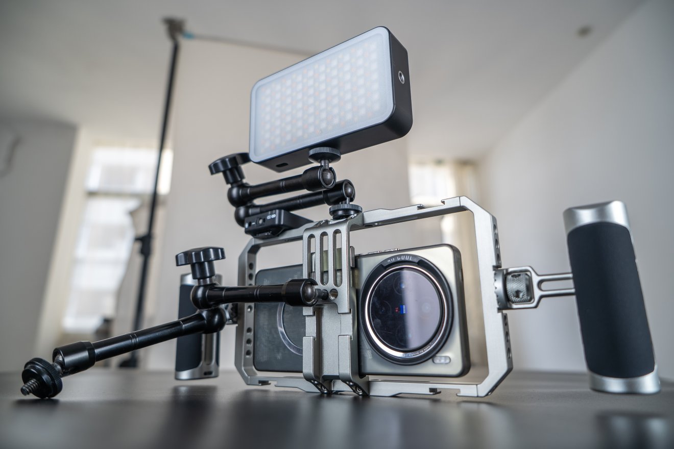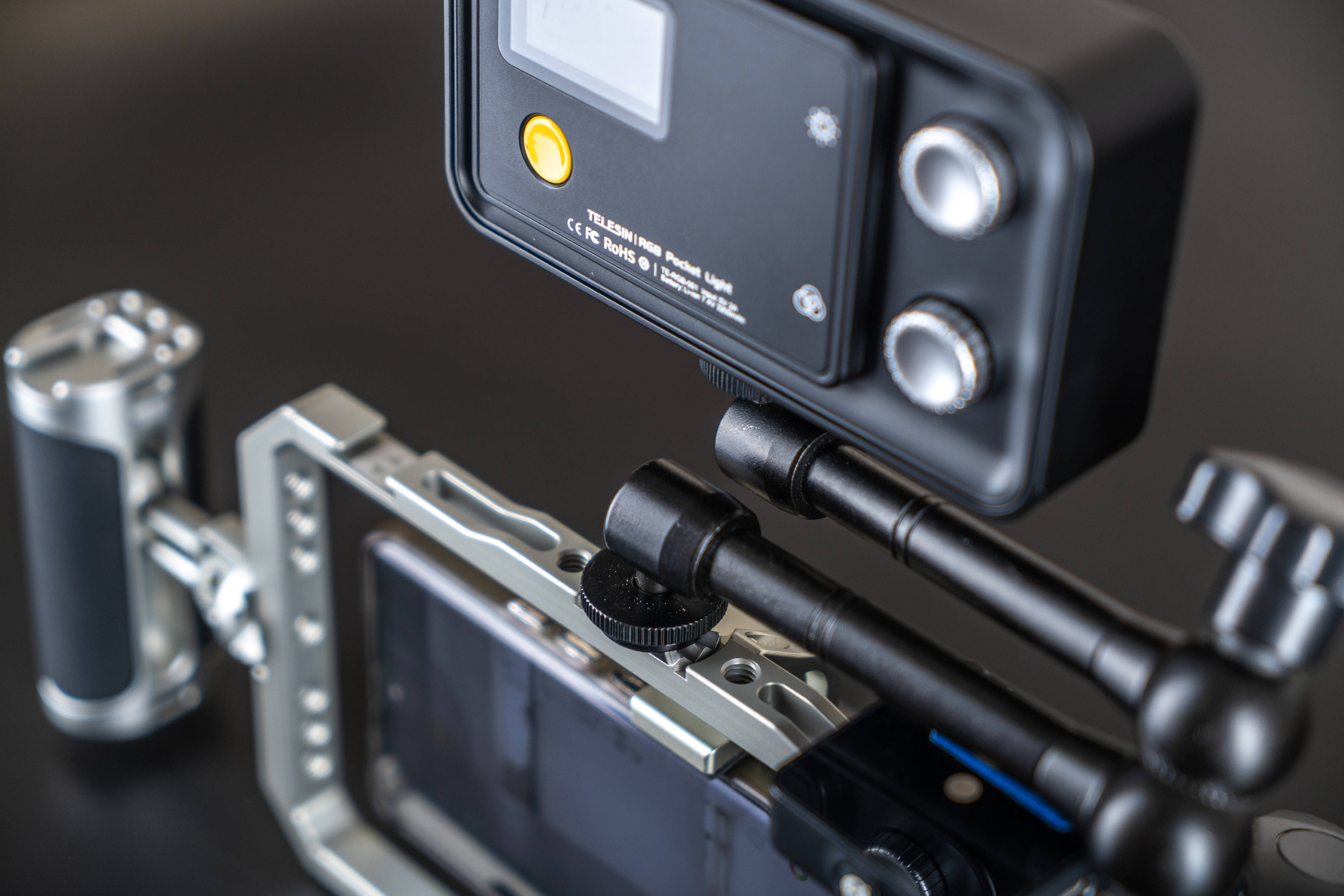 ▼我在顶部中间的1/4螺纹孔上通过魔术手安装了一个RGB补光灯,由于重心改变无法平放桌面,所以我又在背板背面1/4螺纹孔上装了一根魔术手当做支撑杆,专业的感觉一下就上来了,就这样简单的一套组合起来,拍完还能随手往平面上一放进行回看,手机因为有兔笼保护,完全不怕磕碰