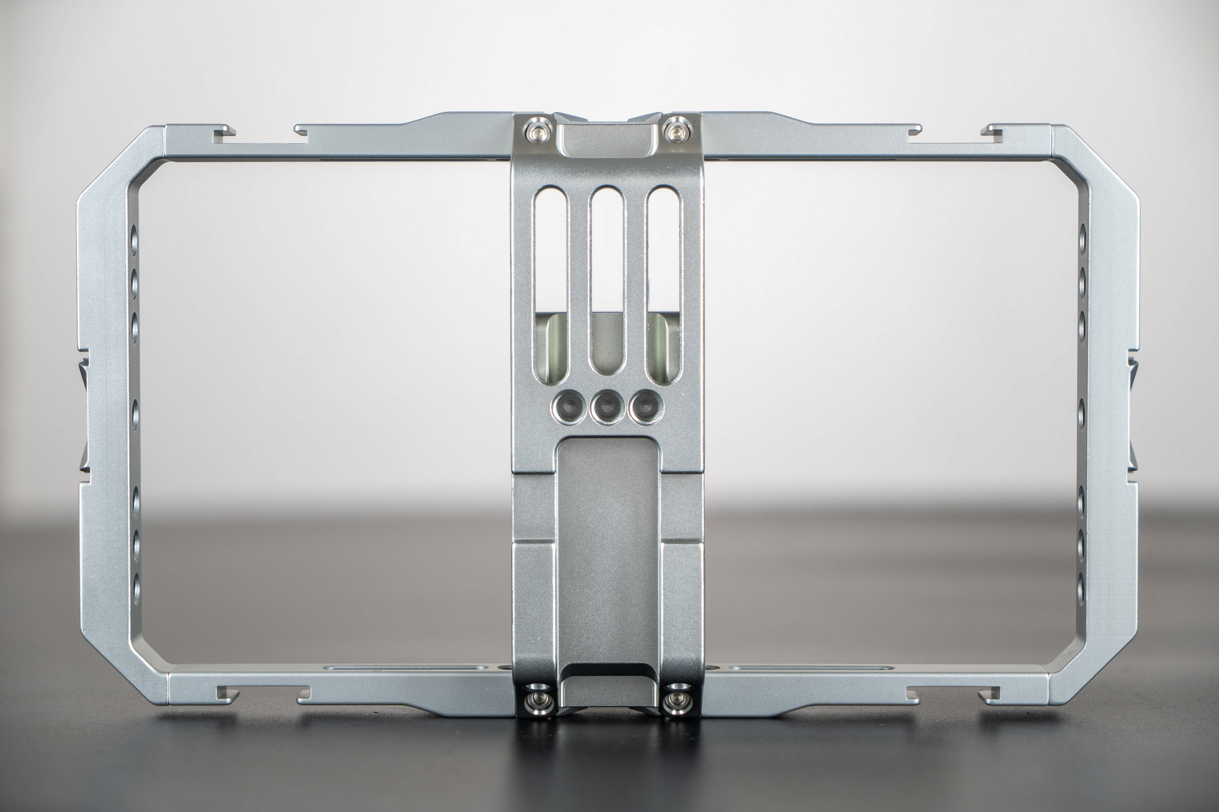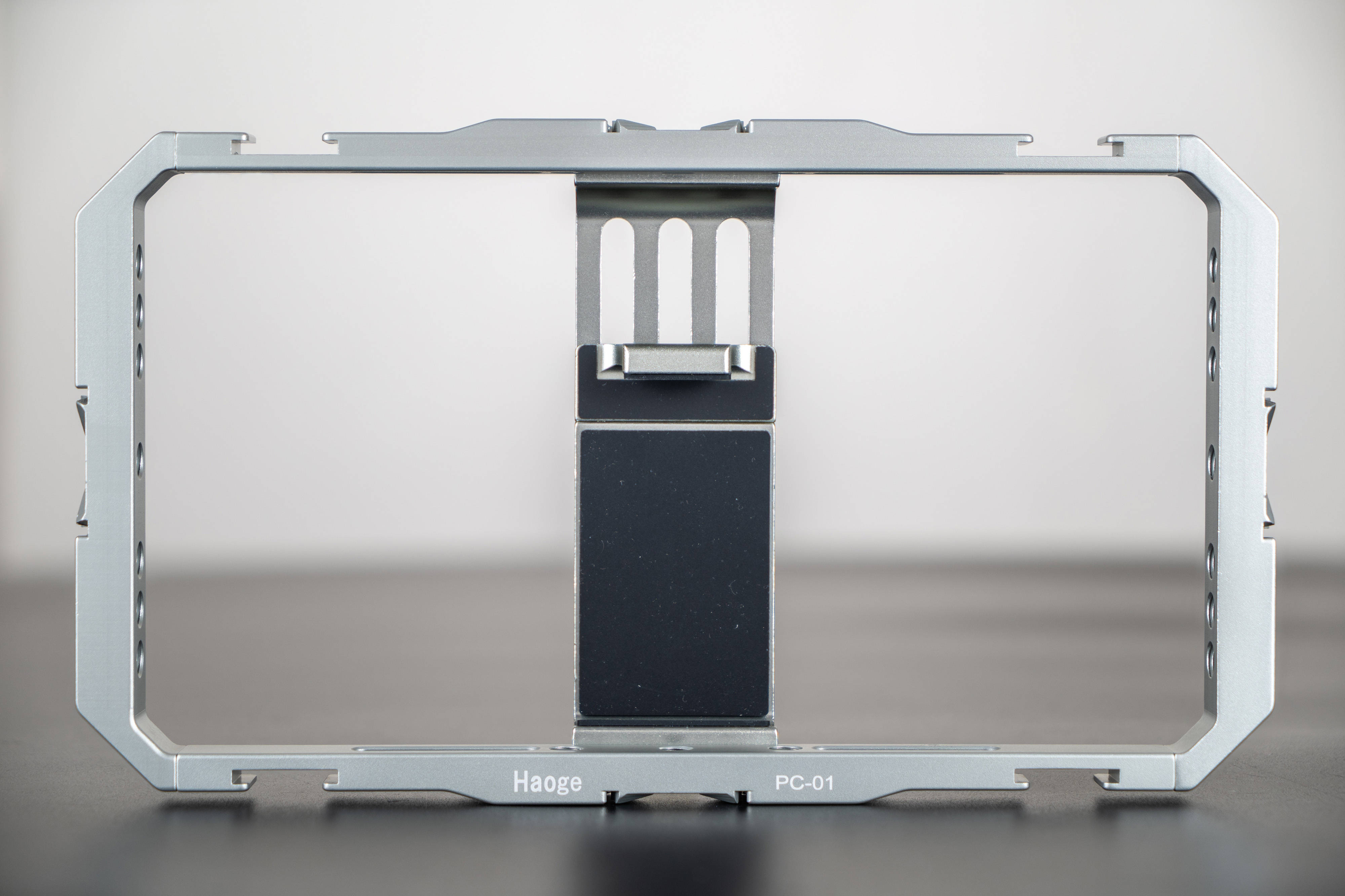 ▼整体是由一圈边框和一个手机夹两部分组成,材质应该都是铝合金的,兔笼表面处理工艺非常好,做工一看就不错,框架正面下方印了品牌LOGO和型号;从正面直接能看出来兔笼边框上有四个冷靴接口;中间的手机夹可夹持最短66mm、最长90mm宽的手机,兼容市面上大部分主流机型