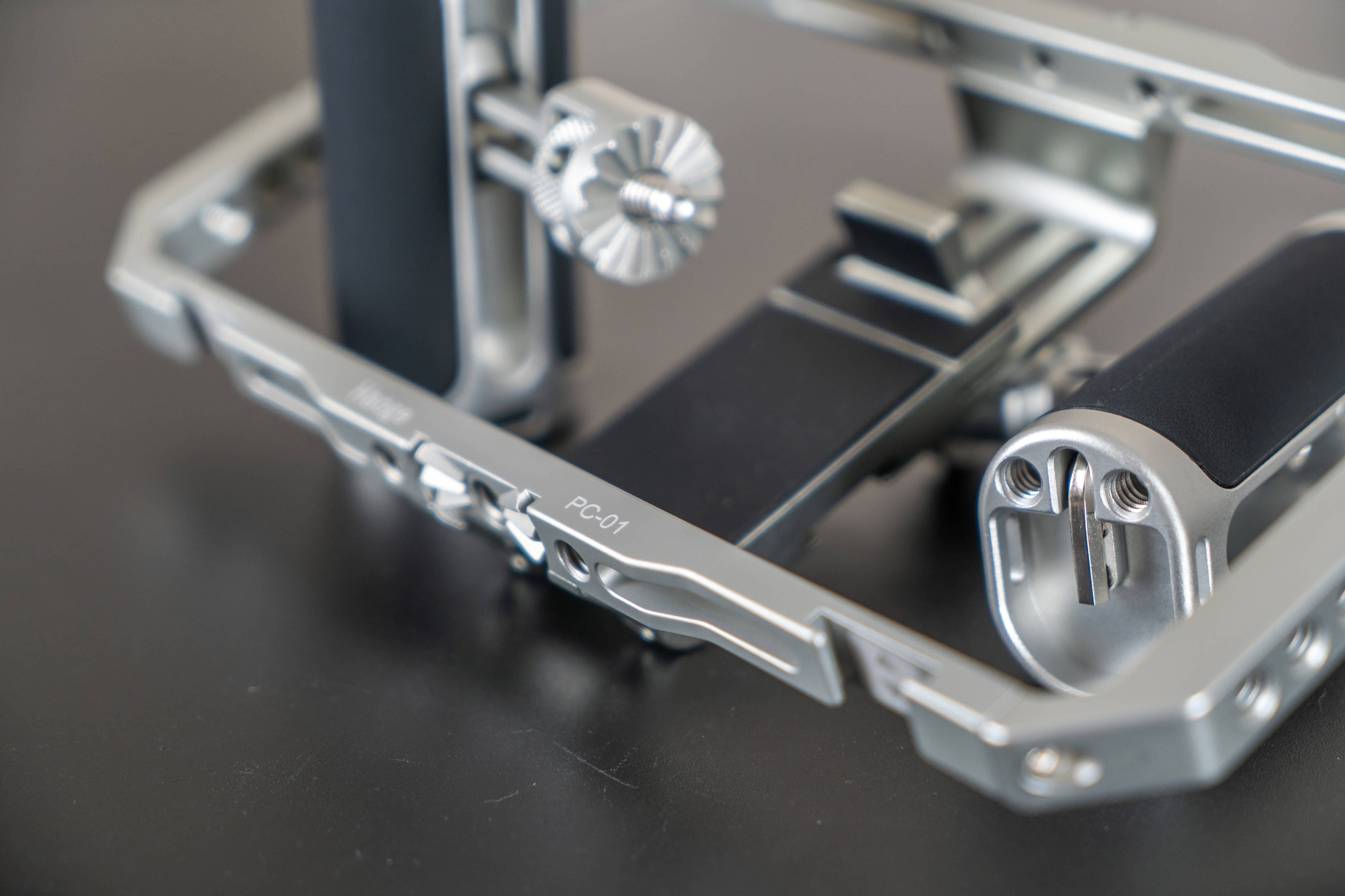 ▼边框左右两侧上各有六个标准的1/4螺纹孔和一个牙盘,上下两侧上各有两个标准的1/4螺纹孔和一个牙盘,该牙盘和阿莱齿牙盘比较像,理论上也是兼容的,一般是用来安装包含但不仅限于手柄或提手配件,牙盘中间的也是1/4螺纹孔,是可以单独拿来使用的;侧面上下两头由内六角螺丝固定,如果把边框左右斜对角两颗拆掉,你就可以得到两个L型半笼,或拆掉其中一侧的两颗螺丝,你就能得到一个C型半笼,各种可实现的玩法大家自行研究;不过边框上并没有阿卡燕尾槽设计,其实我觉得可以增加阿卡燕尾槽,不但能继续增加扩展性和配件兼容性,还能适当减轻整体重量