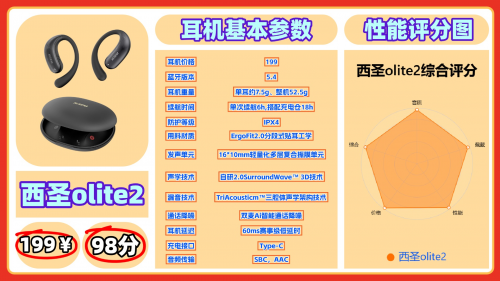 西圣 Olite2 开放式耳机参考售价:199元蓝牙版本:5.4
