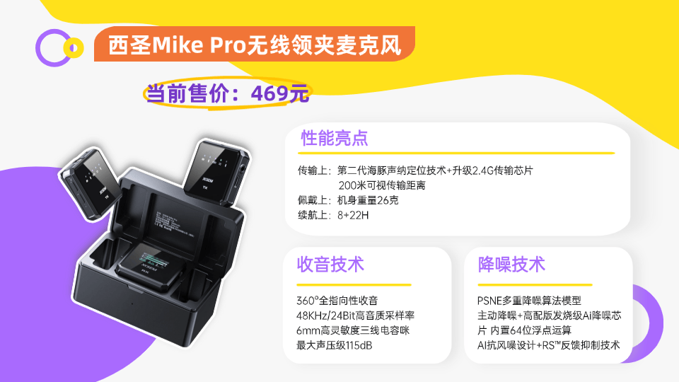 关键在于,西圣Mike2定价只在百元区间,但在拾音规格、降噪水平、平台兼容性和续航方面都达到中高端无线麦克风水准,几乎是用一半预算拿下近乎双倍体验。面对预算有限但对收音要求不低的用户,这款产品没有替代项!