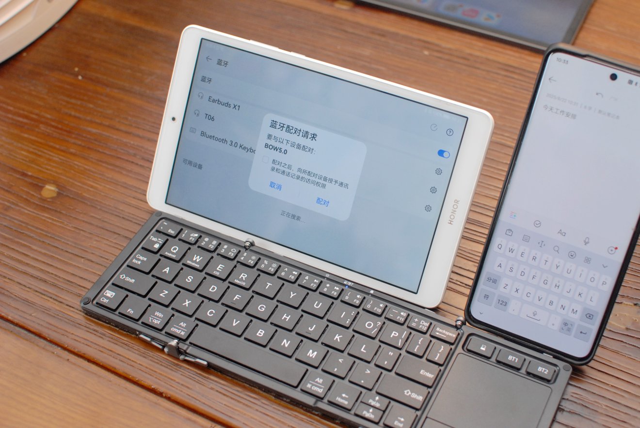 这款键盘最大的亮点之一,就是它的双模带支架设计。想象一下,你正在出差途中,需要紧急处理一些工作,但手头只有一台平板电脑。