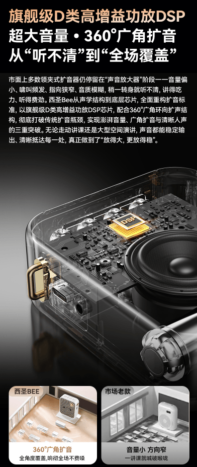 西圣Bee在全场景实用上做到千元档“超配”。超大音量+360°广角扩音,高解析发声单元加持,声音响亮清晰、全场穿透、自如扩音,解决传统扩音器声音局限痛点。