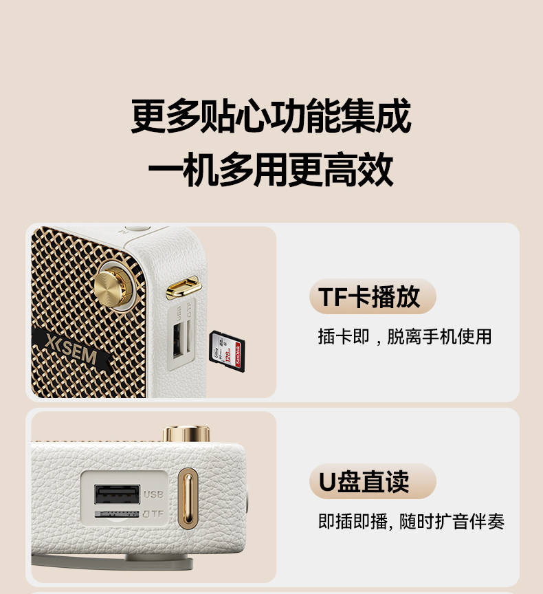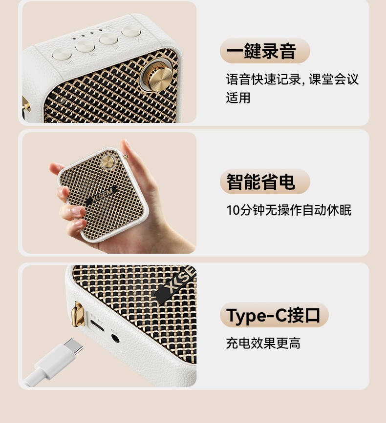 西圣Bee在功能上更是多元集成,打造“全能扩音助手”。其支持双模扩音,有线无线自由切换,适配不同设备与场景;TF卡播放、U盘直读、一键录音,满足教学存课件、活动录内容、户外放音乐等需求;蓝牙5.0升级加持,连接更稳、传输更快,适配手机、平板等智能设备;Type-C接口兼容主流设备,充电便捷,让用户彻底告别续航焦虑,实用又高效。