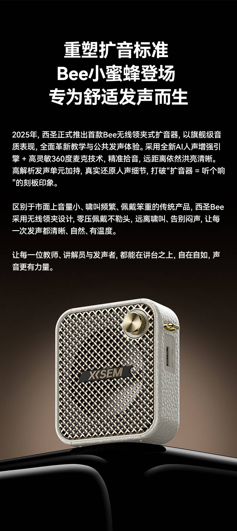 西圣Bee以音质突破、全场景适配、颜值功能兼具的全面实力,重新定义千元级扩音器标准。从技术创新到细节打磨,深度考量用户体验,为教师、活动策划者、户外工作者等务实派用户,交出“音质清晰+实用全能”的满意答卷。在扩音器市场功能同质化困境中,西圣Bee以“旗舰级听感+全场景实用”姿态破局,诠释西圣重塑扩音体验理念,成为千元级扩音器中当之无愧的性价比新标杆。