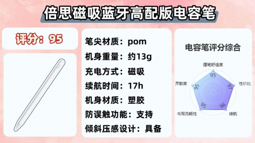 这款电容笔采用无缝一体化设计,表面触感细腻,不易沾染灰尘。而且机身重量仅约13g,握持感很是轻便,长时间使用对手腕负担较小。书写时笔尖流畅跟手,并支持自动唤醒功能,提起即可进入工作状态,无需长按按键,让我们的操作更省力。另外它的充电方式为磁吸iPad,随手一放就能充上,很是方便,并且充满可以持续使用约17小时,足以应对长时间的创作需求。不过,其适配的iPad机型有限,入手前需确认兼容性,若不匹配则需要配合充电舱使用。