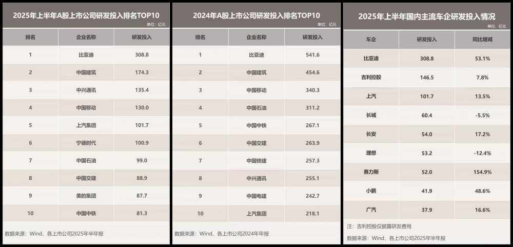 比亚迪再度荣膺A股"研发之王"称号,巨额研发投入迎来技术爆发,颠覆性创新成果密集落地。技术突破的底层支撑源于其独特的成长密码——通过持续性研发投入构建技术护城河。数据显示,今年上半年比亚迪研发投入达309亿元,同比增幅53%,研发投入强度较净利润高出100%。2024年更是以542亿元年度研发支出、36%的同比增速,首次问鼎A股年度研发之王。
