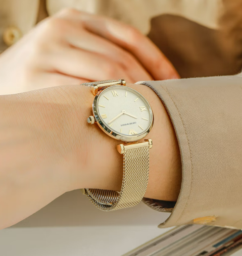 手表的表带采用了精美的琉璃金编织设计,线条流畅,完美贴合手腕。金属光泽的表冠,螺纹设计,调时方便,自带吸睛魅力。而且,表带长度175 +/-5MM,表带宽度14 (MM),无论是手腕粗细,都能找到最合适的尺寸。