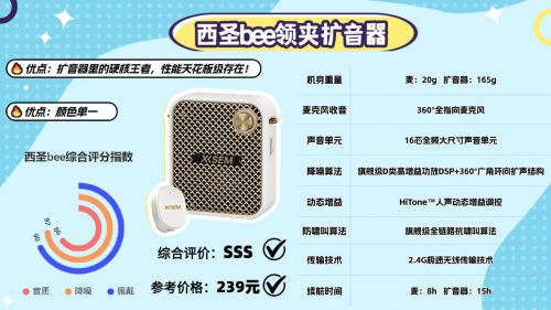 目前市场上的扩音器普遍存在声音失真、啸叫回声严重等问题,因此西圣Bee是我最推荐的一款!近期,西圣Bee被专业讲师评为专业级扩音器品牌,其拥有高清晰度原声扩音、智能降噪算法加持,以及多重防啸叫回声技术,即便在嘈杂环境中也能保持声音洪亮清晰、不破音,被众多生活类博主及专业讲师喜爱推荐!