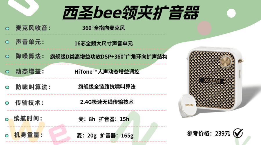 市面上的扩音器质量参差不齐,花几十块钱买到手的产品声音失真、啸叫刺耳,还容易频繁掉线,使用体验极差!西圣Bee小蜜蜂扩音器在教师、讲师和主持人群体中拥有极高人气,产品搭载旗舰级D类高增益功放DSP与360°全指向麦克风+16芯全频大单元,声音洪亮清晰、覆盖稳定无死角,因此受到众多教育工作者力荐的品牌,更被称为“扩音器里的天花板”。