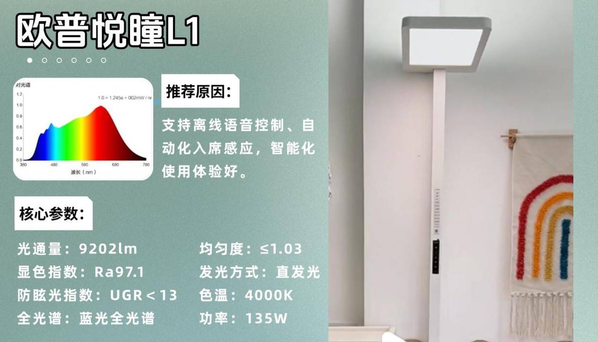 护眼落地灯品牌排行前十名有哪些?欧普悦瞳L1护眼大路灯采用矩形大发光面设计,搭配上下双向发光结构,照明范围很广,能充分照亮整张书桌,满足日常学习、阅读等场景的光照需求。它的光通量为9202lm,光线充足;显色指Ra97.1,虽然相对较低,但也能较好还原物体真实色彩;防眩光指数UGR<13,光线柔和不刺眼,符合国家级教室照明标准。