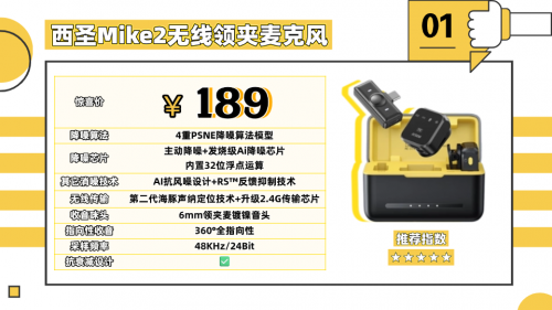 西圣Mike2麦克风专注于打造发烧级性能体验,去除多余功能和型号,专注于一款产品的持续优化。历经数十次升级,优化了200多个性能细节,音质表现、连接稳定性、耐用性均远超竞品。它独创10大黑科技,包括加强版全指向AI感知麦克风、发烧级AI降噪DSP芯片、第二代ALPT高密度拾音技术、4重PSNE降噪算法模型和自研RS™反馈抑制技术等。这些技术使麦克风声音清晰度高达98%,抗噪性达96%,收音效果和稳定性达到旗舰级水准。凭借超高性价比,西圣Mike2在千元以内市场备受好评,被媒体誉为“平价麦克风天花板”。