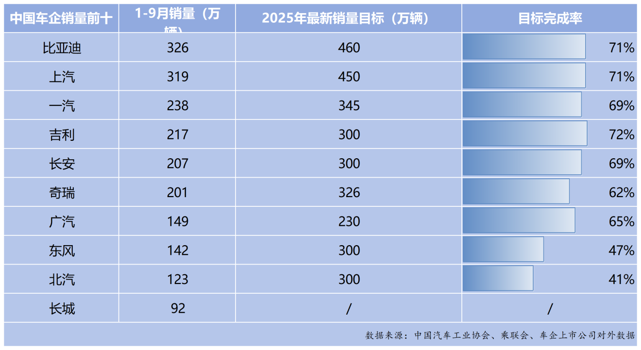 从数据来看,比亚迪依然稳居行业第一。1-9月累计销量达326万辆,完成全年460万辆目标的71%,以持续领先的节奏巩固其在新能源领域的主导地位。上汽集团紧随其后,以319万辆的成绩同样达成71%的目标完成率,在传统燃油与新能源双线布局下保持稳定增长。