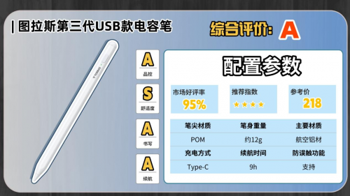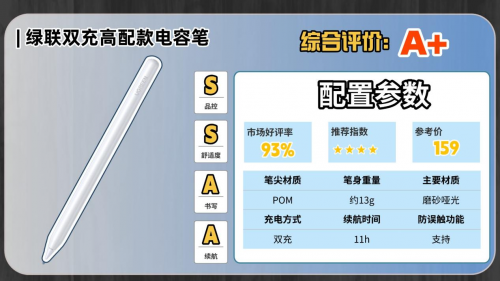 这款电容笔造型简约时尚,使用了铝合金材质的外壳,质感不错,而且笔身重量也仅13g,比较轻巧,不容易使我们的手腕酸痛。书写上,它采用了主动式POM笔头,坚韧耐磨,还可以搭载了双核传导芯片,可以加强信号交互,减少断触情况。充电方式上,它升级为双充,既可以磁吸iPad充电也可以通过USB闪充,兼容性不错,续航也有11小时左右,可以满足长时间的书写需求。但5分钟不用就会自动休眠,虽然可以提升待机时长,但需要频繁开机略显不便。