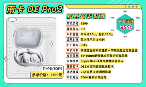 推荐理由:OE系列为南卡专为挂耳式开放式设计,支持定向传音技术、IPX5防水、16.2mm大动圈,低音强劲