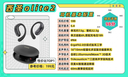 西圣Olite2不到200出头的价格,整个耳机非常有料,蓝牙采用5.4芯片,蓝牙抗干扰性更强,60ms赛事级低延时打游戏也是一点不卡顿!提供18小时超长续航能力、同时还支持AAC和SBC可以说是开放式耳机的六边形战士,百元价位,无脑选这款就够了!