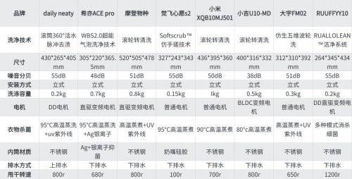 另外我根据这些婴儿洗衣机情况,筛选整理出了一份详细的表格,你可以根据上面的情况直观的看到这几款热门品牌的性能参数: