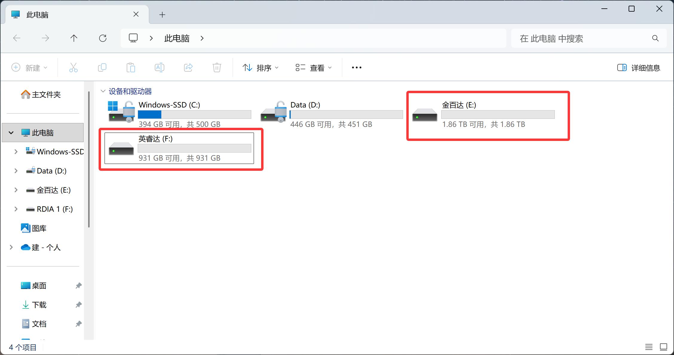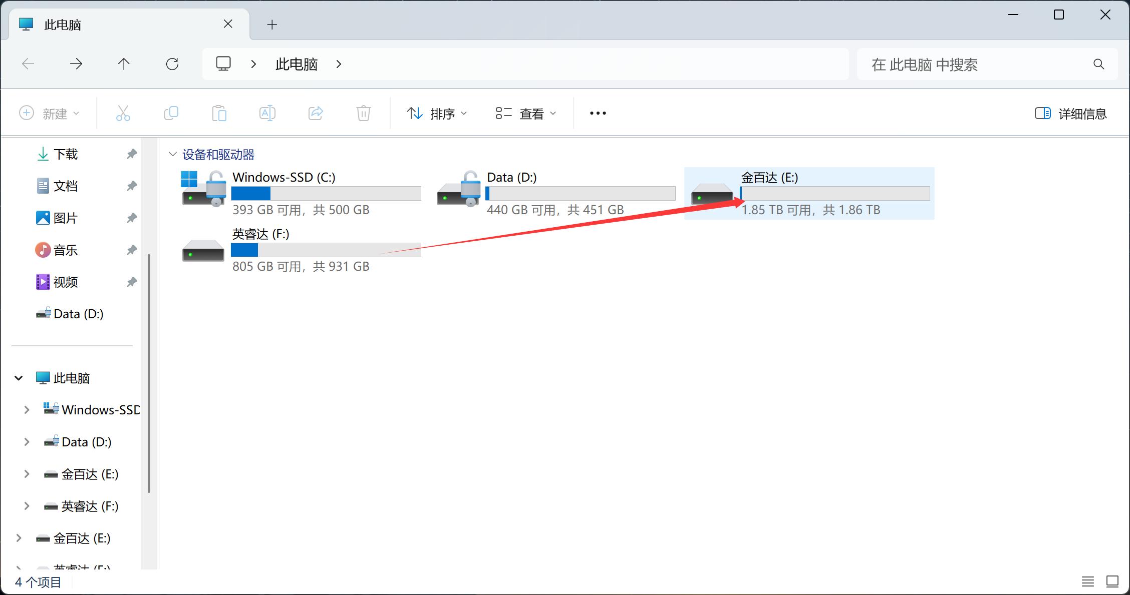 在实际使用中,我将两块NVMe固态硬盘装入后(分别为金百达2T的E盘和英睿达1T的F盘),将其通过数据线连接至电脑的对应高速接口,它瞬间就变身为一款超大容量的移动硬盘。