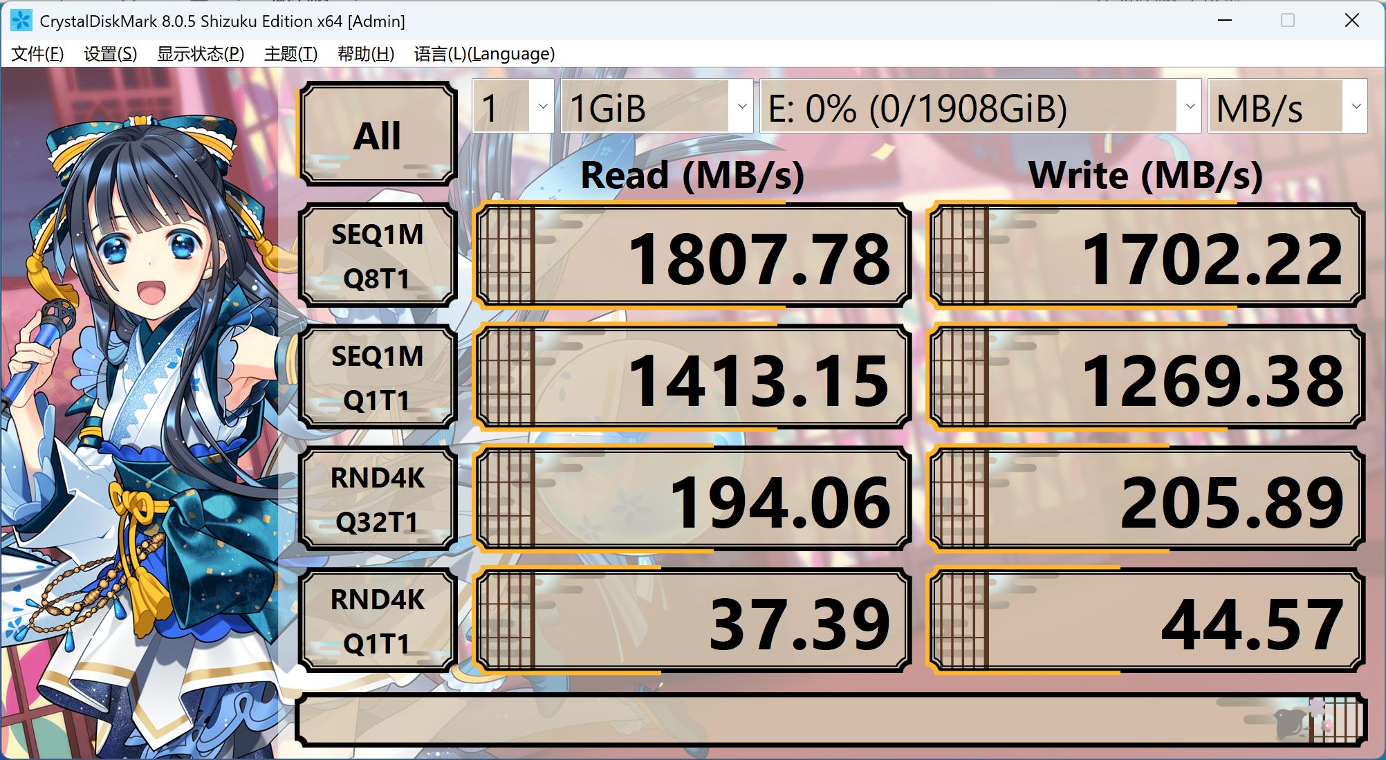 使用CrystalDiskMark测试,读取速度为1807.78MB/s,写入速度也达到了1702.22MB/s,基本达到了USB3.2 Gen2*2接口的上限。