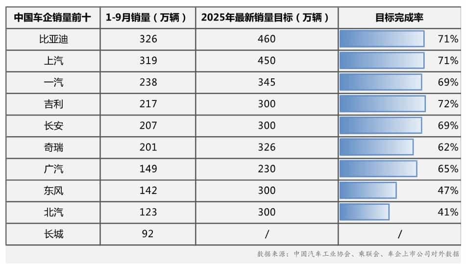 在“金九银十”销售旺季推动下,2025年前三季度中国车市整体稳中向好,新能源渗透率持续高位运行,多家车企销量目标达成率亮眼。行业头部企业表现突出,比亚迪以326万辆销量实现71%的目标完成率,上汽集团也以319.3万辆达成71%。第二梯队中,吉利汽车以72%的完成率领跑,一汽、长安分别完成69%,奇瑞和广汽则达到62%和65%。