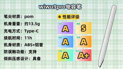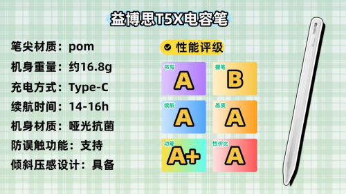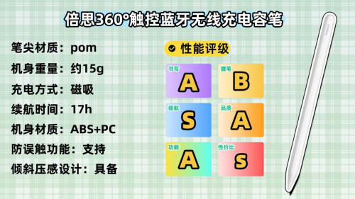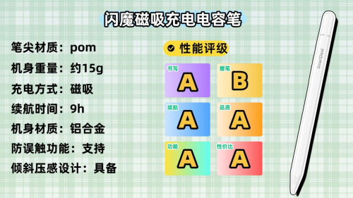 这款电容笔采用简约设计,整体外观清爽利落,给人一种干净纯粹的视觉感受。而且笔身轻盈,重量约为12克,握持舒适,长时间使用也不易感到疲劳。操作上非常便捷,只需长按笔头3秒即可开机使用,无需蓝牙配对或安装额外APP,省去了繁琐的连接步骤。书写表现方面,POM的笔尖材质耐磨,响应迅速,搭配防误触功能,无论是记笔记还是绘画,都能保持流畅顺滑的体验。充电采用主流的Type-C接口,约半小时即可充满,续航时间可达9小时,完全满足日常学习与创作需求。不过,它的定价相对较高,更适合对使用体验有要求且预算充足的用户。