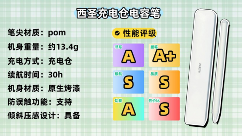 续航方面,西圣电容笔的表现同样令人印象深刻。它采用了独特的充电仓设计,使得其总续航能够达到30小时左右,是市面上续航表现最强的电容笔之一。综合来看,西圣电容笔凭借其高流畅度、零延迟的触控体验、倾斜压感功能的灵敏性、舒适的握笔感以及超长续航,已经成为了性价比最高的平替电容笔之一。