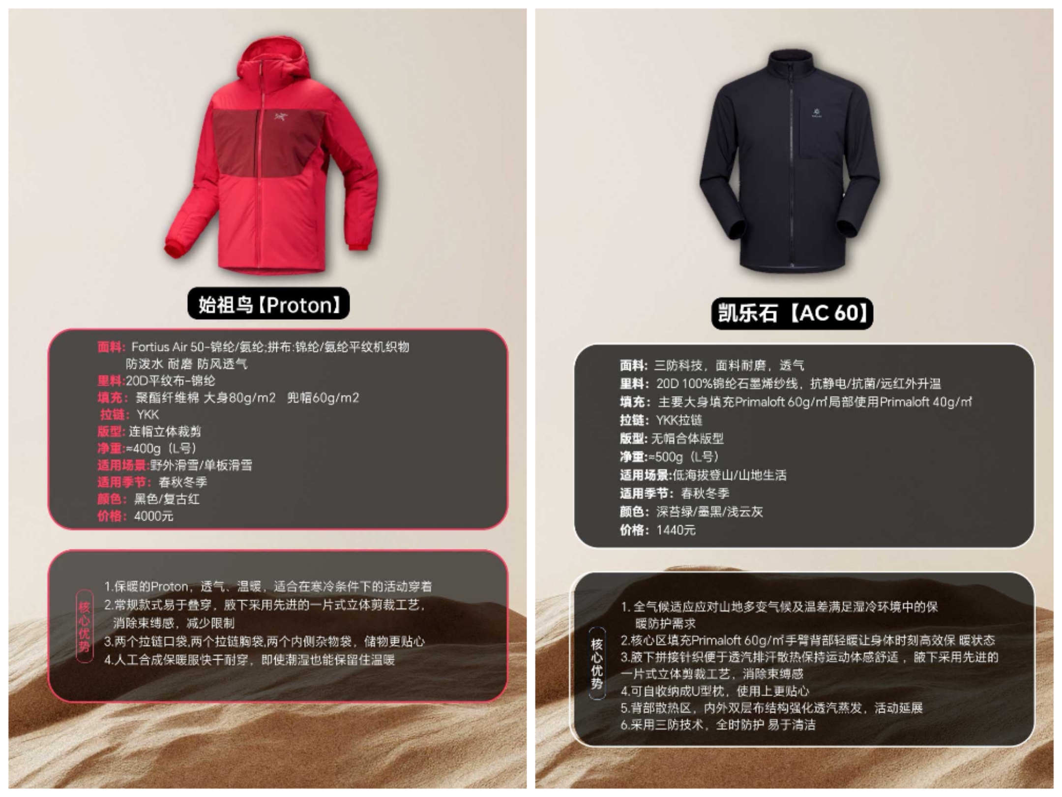 这两个品牌在户外棉服里的定位比较高端,前面的四千左右另一个也有一千多。那么具体表现怎么样呢?我给罗列一下这两款衣服的主要特点。始祖鸟下单链接