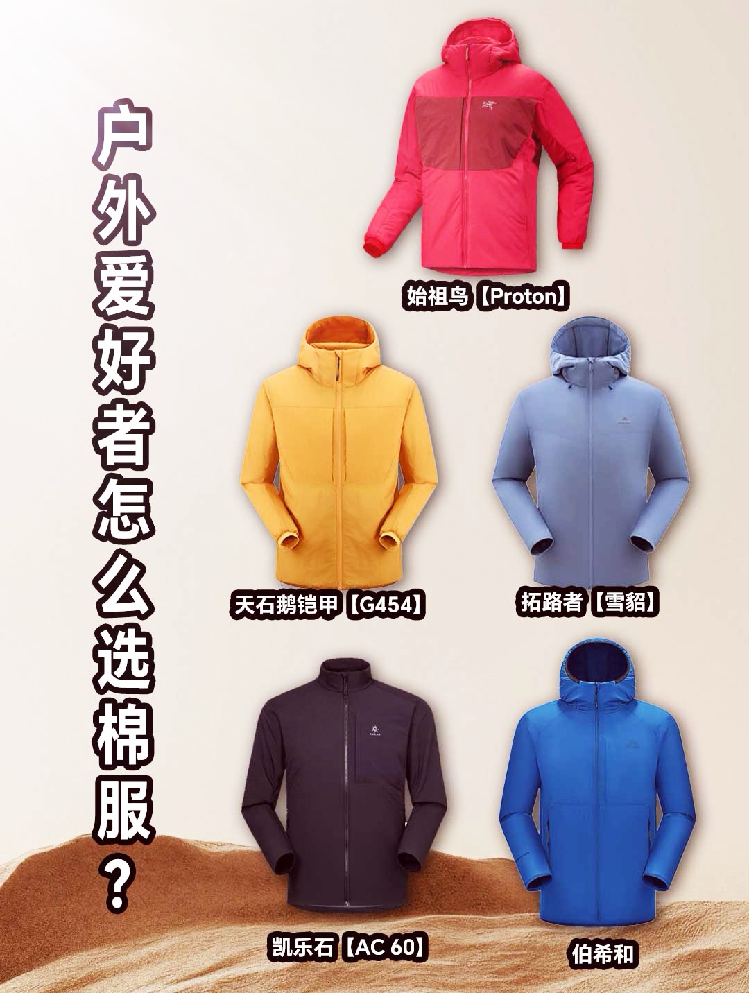 说了这么多,很多户外小白大部分认为,既然是为了保温,我穿羽绒服不一样可以吗?其实不然,最近几年羽绒价格飞涨,首先是羽绒服性价比并不高,再者遇到雨雪天气,羽绒一旦被浸湿,就失去了保温的作用,甚至还会变得更加冰冷。尤其是户外活动,气候变化不可预测,突遇暴风雨,户外棉服防风防水的优点,是羽绒服替代不了的。这也是为什么最近几年,那么多的户外爱好者,均义无反顾地选择了户外棉服。而以上五款棉服,两款作为定价高端的产品,如果没有特别极端的需求,除非是大款可以闭眼入。 其实我更倾向于后三款,作为我们日常使用或者偶尔探险。性价比懂的都懂,在目前国际环境下,省到就是赚到。天石鹅铠甲的G454在这几款里面是算性价比高的了,毕竟一线的品质入门的价格谁不喜欢呢?下单链接