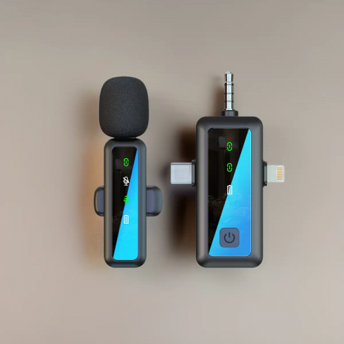 机身呈紧凑方块造型,发射器约33g、接收器29g,搭配弹力背夹,夹在衣领或相机热靴上稳固不晃,长时间拍摄无坠感。收发端均带OLED屏,电量、信号、录音状态一目了然,新手也能快速上手。配件超齐全,Lightning、Type-C转接线和OTG头一站式配齐,手机、相机、电脑都能直接连,不用额外采购适配器。