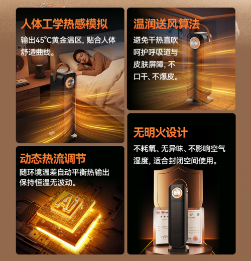 自研系统融合人体工学热感模拟、温润送风算法、动态热流调节三大黑科技,每一缕热风都精准贴合人体舒适需求——锁定黄金45°C温区,风温柔得像春日晨雾,不刺喉、不刮脸,彻底杜绝干热直吹,从根源守护呼吸道与皮肤屏障,取暖再久也不口干、不爆皮。