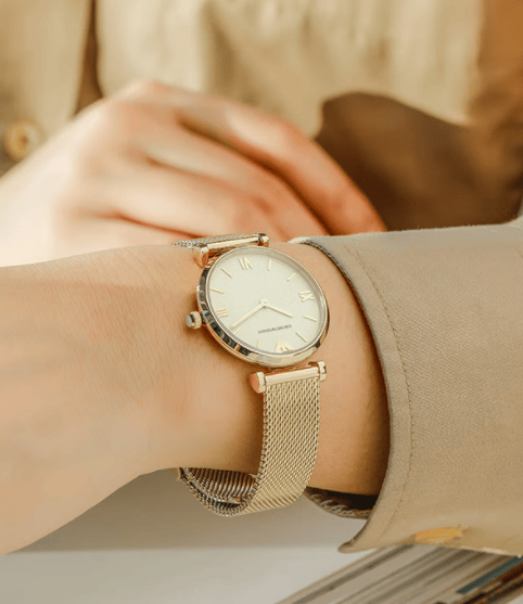 手表的表带采用了精美的琉璃金编织设计,线条流畅,完美贴合手腕。金属光泽的表冠,螺纹设计,调时方便,自带吸睛魅力。而且,表带长度175 +/-5MM,表带宽度14 (MM),无论是手腕粗细,都能找到最合适的尺寸。