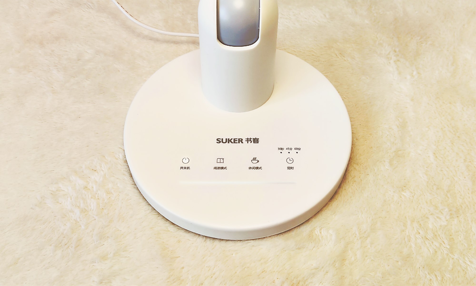 书客/suker SKY护眼台灯的操控非常简单,按键采用触摸控制,并且配有白色背景灯,轻触即可点亮,其中定时键采用滚动切换模式,轻按即可在30/45/60间循环设置。另外,阅读/休闲模式还具备不断电记忆功能,会自动保存使用亮度。