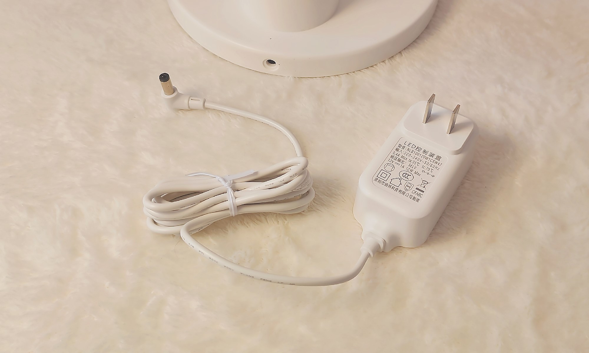 电源适配器是12W专用LED控制装置,接入端是国标一体式两相插头,输出端是圆柱形DC插头,输出功率为12V1A;白色电源线缆长约1.8米,线规为24AWG,结实耐用。