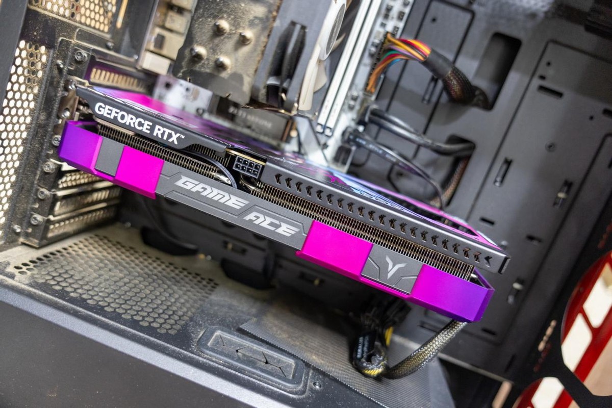 从上方看,可以看到风扇主体上部还有game ACE的ARGB灯光系统,右侧还有个Logo灯。中间部分可以看到散热器主体的部分,这里还有个8Pin显卡供电接口。