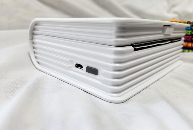 喵喵机MAX打印机打印机右侧面为打印纸的出口,其宽度达到了4英寸,折合为10.16厘米,打印纸的出口的下部为开盖键,轻轻按压即可将打印机打开。我们只要把将上下盖轻轻一推,就可以打开上边盖子。