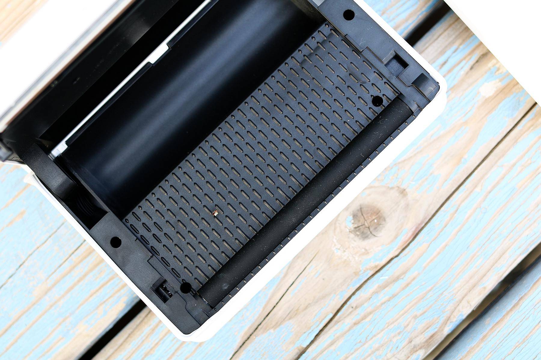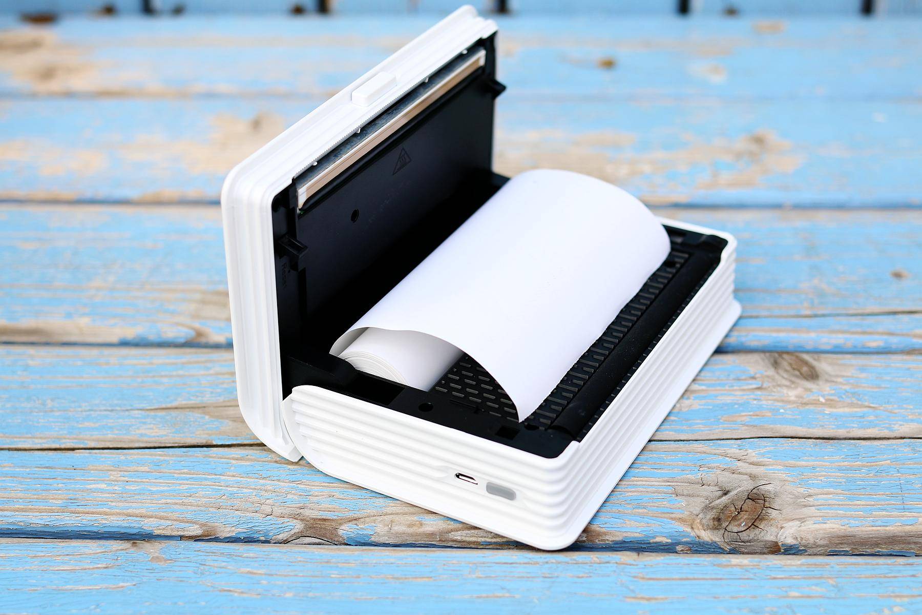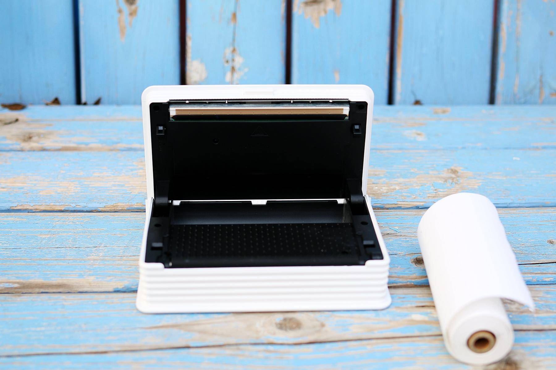 右侧面是打印机的出纸口,上面布置的这个按键,是打印机的开盖键。按下开盖键就可以打开上机盖。在打印机内部已经安装了一卷打印耗材,喵喵机附带的这卷耗材为10年环保纸,不含双酚-A,留影长达10年之久。