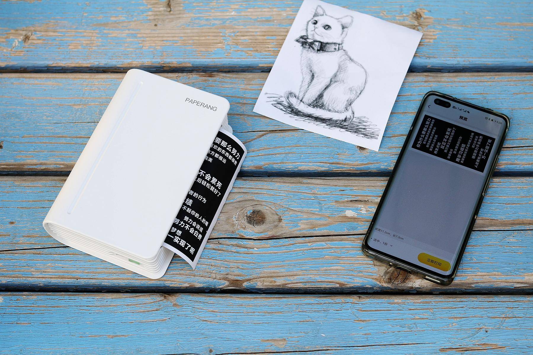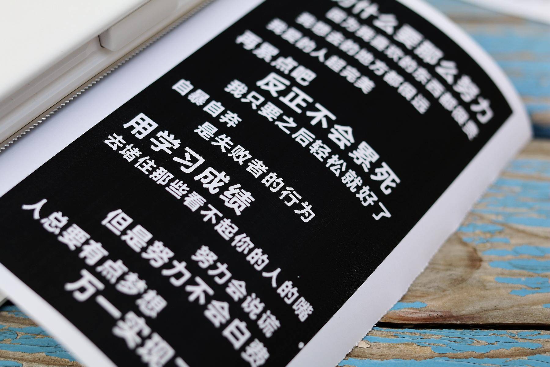 对于喵喵机C1便携打印机的打印效果,通过图片、文本及不同浓度的打印效果来看,我还是比较满意的。这张以黑色底面打印出的文稿,底面黑色均匀,字体边缘几乎看不出有毛刺现象,要比普通喷墨打印机的效果更佳一些。不过,这个稿件也有一点小瑕疵,就是在“看不起你的人的嘴”的第二个的字上方有一处微小的小白点。