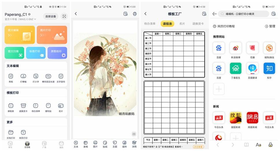 喵喵机的百宝箱内除了有强大的图文编辑功能外,还可以通过模板打印出课程表、退换货卡、待办清单、便利贴和名片等;另外,在更多选项里还支持文档打印或网页打印功能。