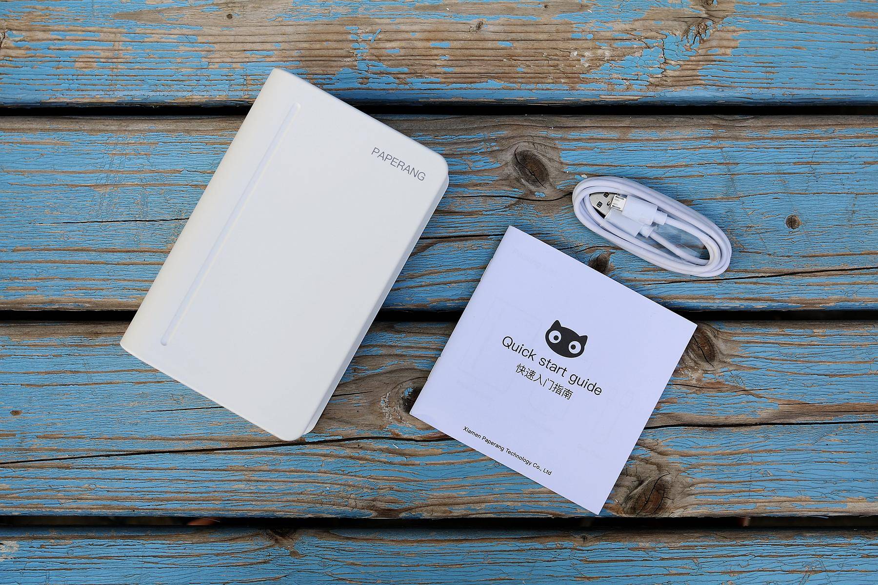 打开包装,内部是黑色的纸盒,除了打印机外,还有一本快速入门指南和一条数据线。