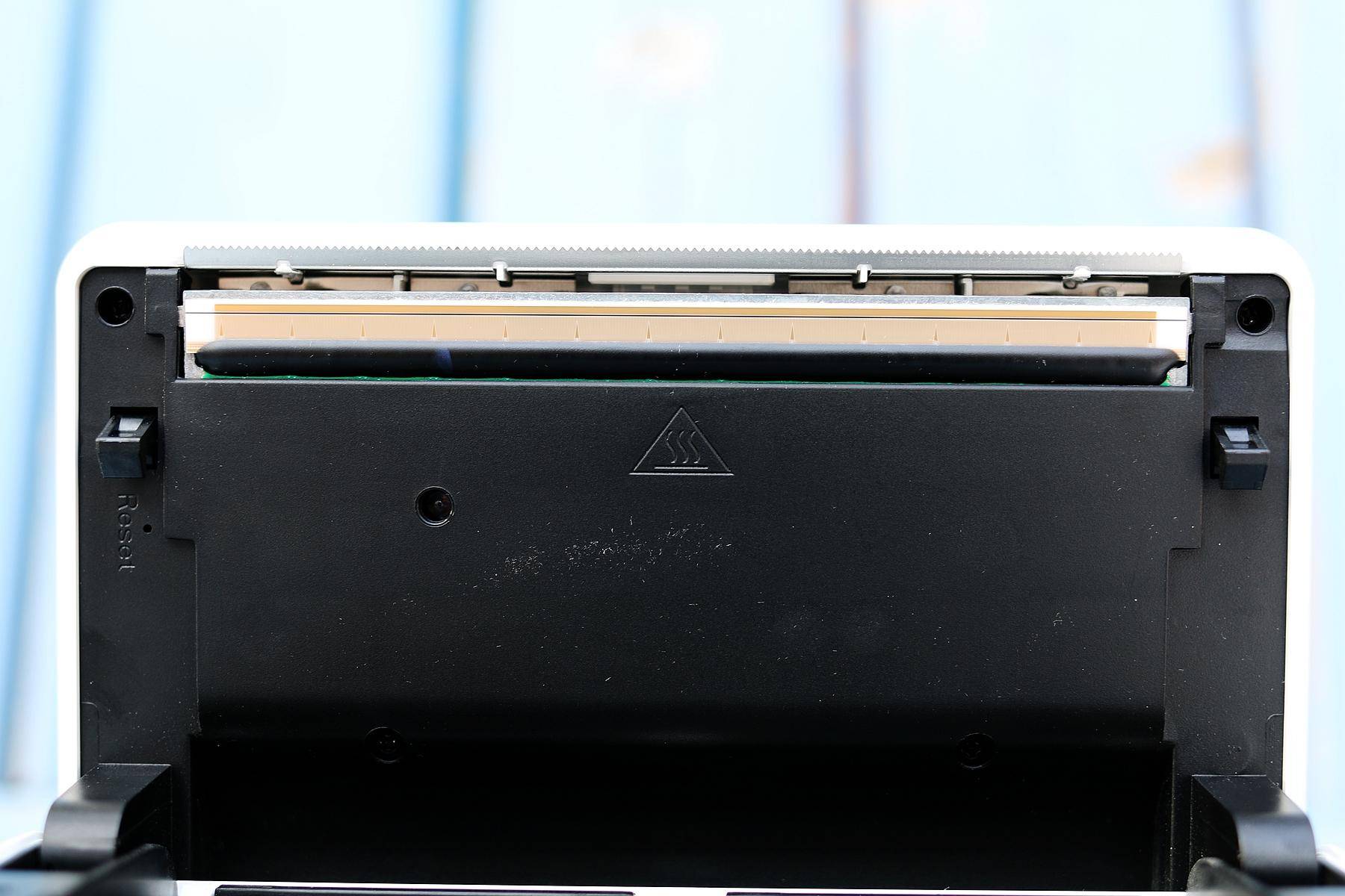 打印机内部,除了送纸胶辊和打印头外,还有耗材检测传感器和45°锯齿状的撕纸机构等。这里要注意一下,打印头在打印过程中会产生高温,在更换耗材时要注意不要碰触到打印头。