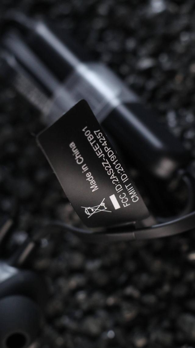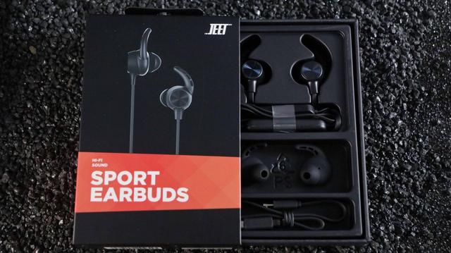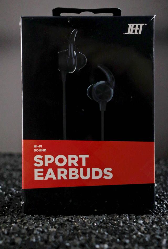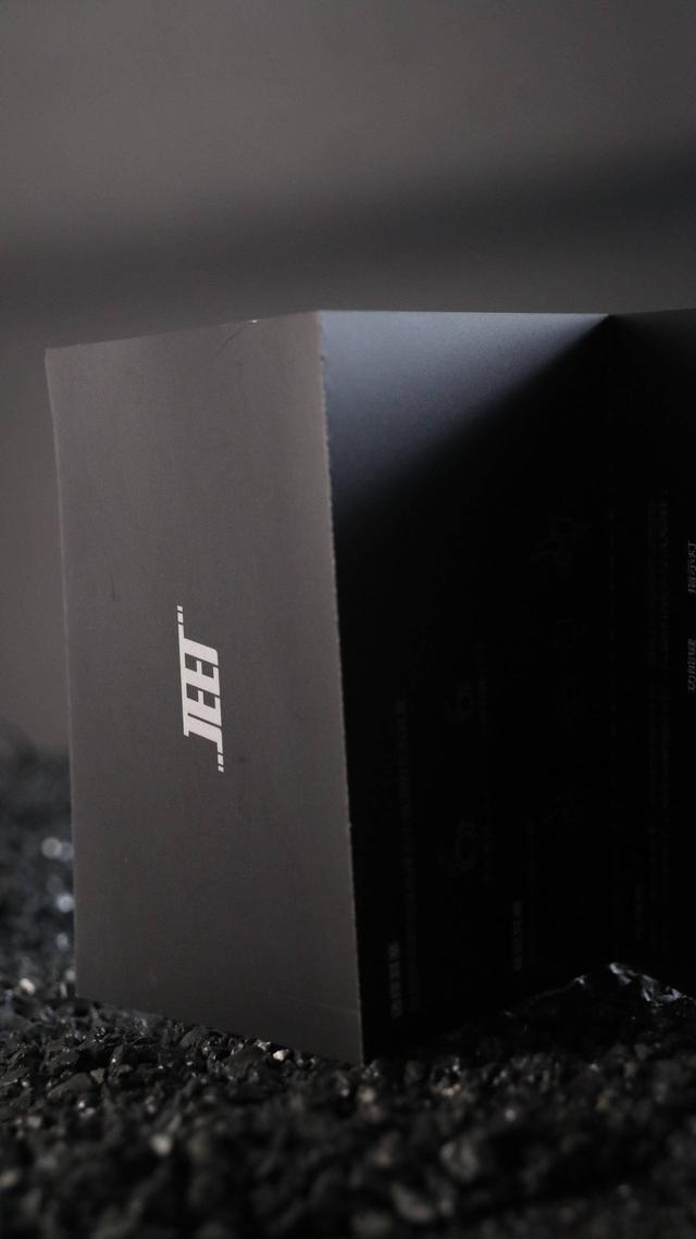 首先来看包装盒, 在最外面的包装盒正上方有一个提手非常的人性化,整体是黑色的纸盒包装,经典的配色永远都不会过时,而在正下方则是一条红色的SPORT EARBUDS 再次把产品你的档次得到了一份提升,右上角则是英文艺术字体的JEET。
