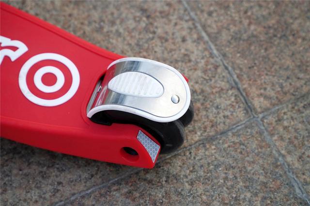 首先是刹车片,可以看到m-cro迈古迷嬉滑板车的刹车片明显更大,包裹性也更好,带来的急停性能和安全性自然更佳。同时后轮处还有一对反光贴纸,在晚上也能起到安全警示作用。