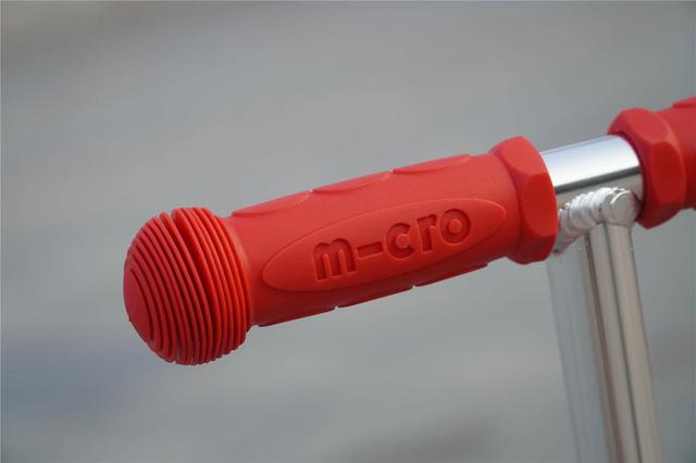 m-cro迈古迷嬉滑板车的车把处使用了球形防撞设计,采用无毒硅胶制作,相比较很多市面上使用劣质塑料的产品来说,安全性更高。自从以前看过央视关于回收塑料制作儿童玩具的新闻之后,我就非常注意这一点,生怕孩子使用劣质产品造成身体伤害。